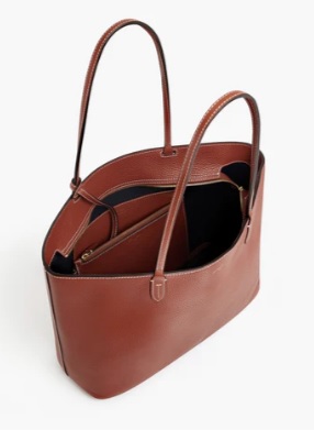 Grand sac cabas zippé en cuir grainé double face intérieur contrasté et pochette amovible. Porté épaule. Peut contenir un ordinateur 16″.