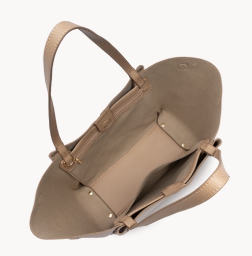 Ce grand sac cabas épaule de la ligne Sierra Haus est confectionné de refente de cuir de vachette finition grainé. Il possède trois poches intérieures simple. Grâce à des aimants discrets, les côtés du sac se replient pour offrir deux formes différentes : une version cabas ouverte ou une version plus structurée.